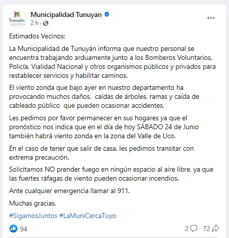 En un comunicado emitido esta tarde, desde la Municipalidad de Tunuyán advirtieron a la población por los daños ocasionados por el viento Zonda el viernes y pidieron "por favor permanecer en sus hogares" durante el sábado 24 debido a que el pronóstico para la jornada es similar. "En el caso de tener que salir de casa, les pedimos transitar con extrema precaución", expresaron fuentes oficiales.