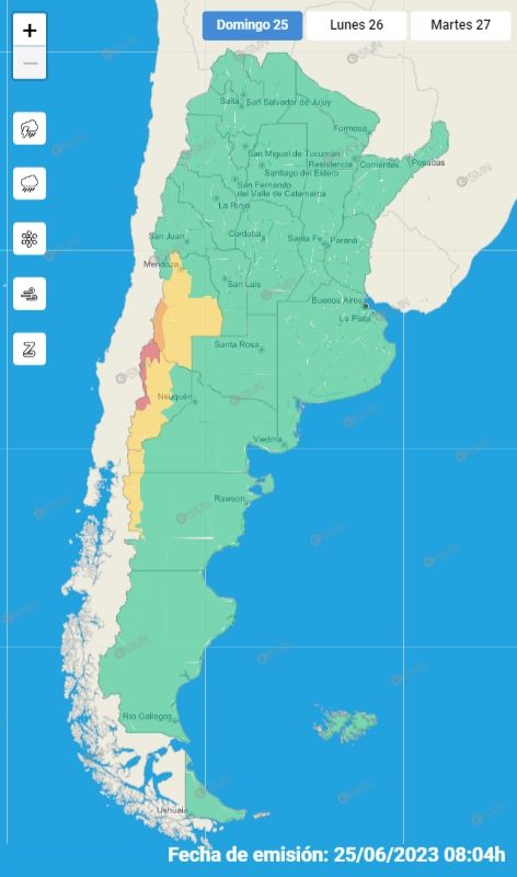Finalmente, para el área cordillerana de Malargüe y San Rafael rige una alerta naranja por nevadas. "El área será afectada por nevadas intensas y persistentes. La nieve acumulada puede alcanzar valores entre 70 y 100 cm diarios, pudiendo ser superados en forma puntual. En las zonas más bajas las precipitaciones podrán registrarse en forma de lluvias. El fenómeno también estará acompañado por vientos fuertes, por lo que puede generarse reducción de visibilidad por nieve en suspensión", aseguran desde la entidad.