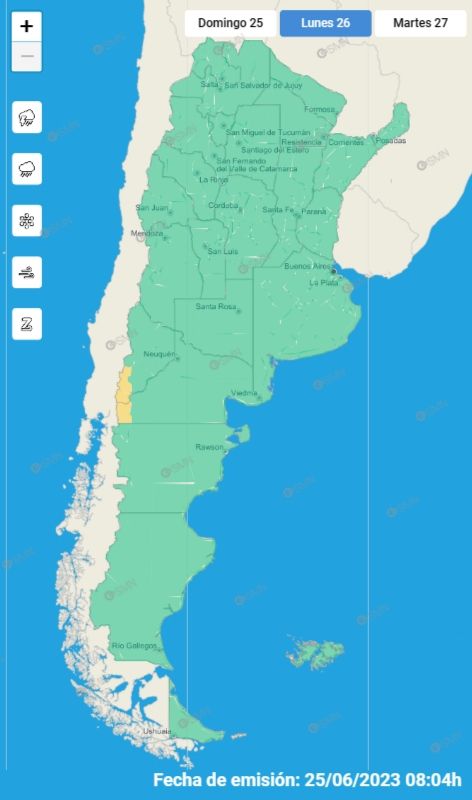 El Servicio Meteorológico Nacional (SNM), a través de su Sistema de Alertas Meteorológicas Tempranas (SAT), pronostica para este lunes altas probabilidades de ocurrencia de lluvias y nevadas intensas que afectarán algunas provincias. Debido a la magnitud del fenómeno emitió una alerta meteorológica amarilla.
