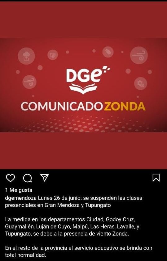 En la mañana de este lunes, la Dirección General de Escuelas (DGE) informó que se suspenden las clases en los siguientes departamentos: Ciudad, Godoy Cruz, Guaymallén, Luján de Cuyo, Maipú, Las Heras, Tupungato y Lavalle y en esa localidad lujanina. La medida se tomó debido a que el viento Zonda continúa muy intenso.