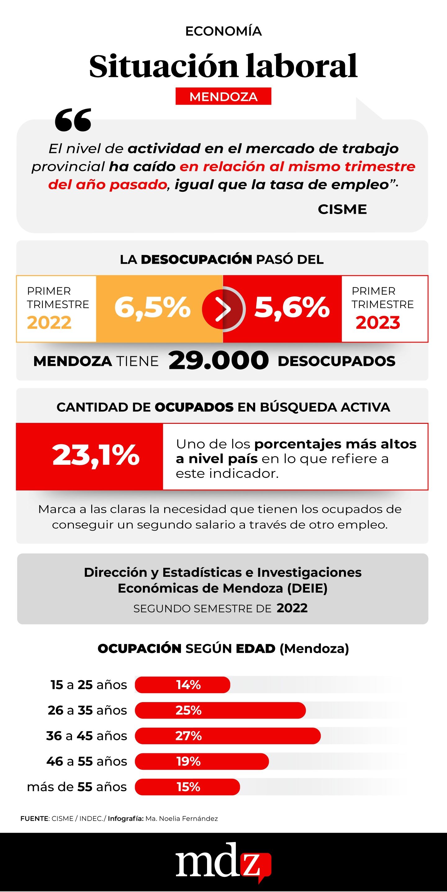 En el informe, el CISME hace un análisis sobre la situación del mercado laboral actual de Mendoza, y explica que el panorama existente es el siguiente: “El nivel de actividad en el mercado de trabajo provincial ha caído en relación al mismo trimestre del año pasado, igual que la tasa de empleo; eso es fundamental para entender la dinámica de la desocupación que pasó de 6,5% en el primer trimestre de 2022 al 5,6% en el primer trimestre de 2023”, comentan desde el organismo, que asegura que en Mendoza hay 29.000 desocupados.