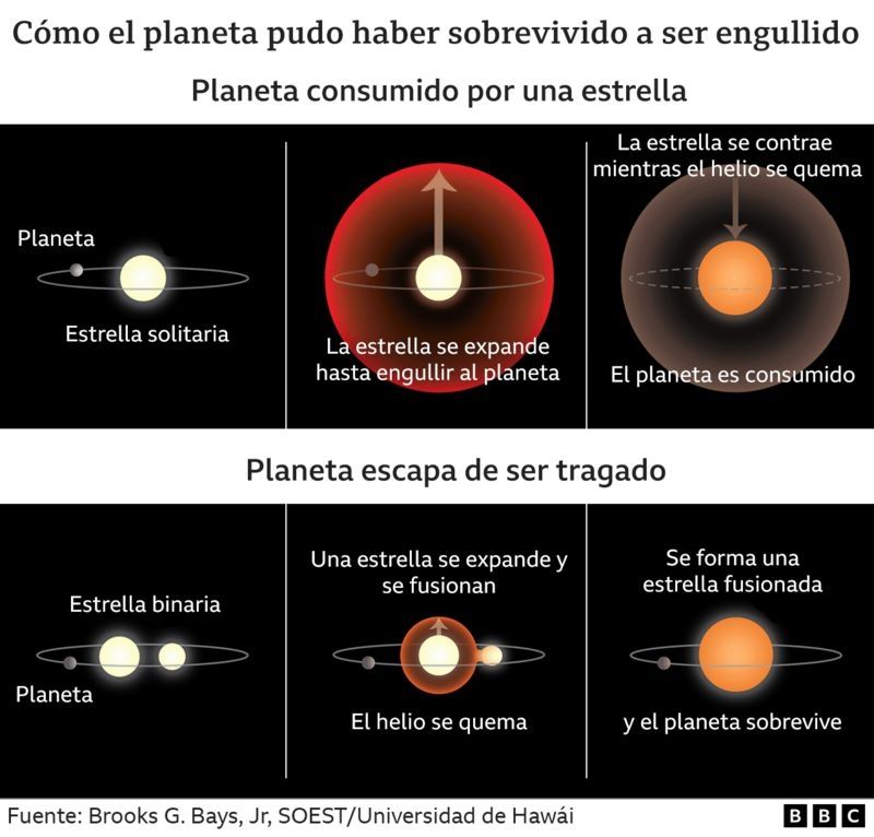 Su estudio indica que fue salvado por el hecho de que la estrella moribunda alguna vez tuvo una compañera que frenó la expansión de la primera, lo que impidió que se “tragara” al planeta.