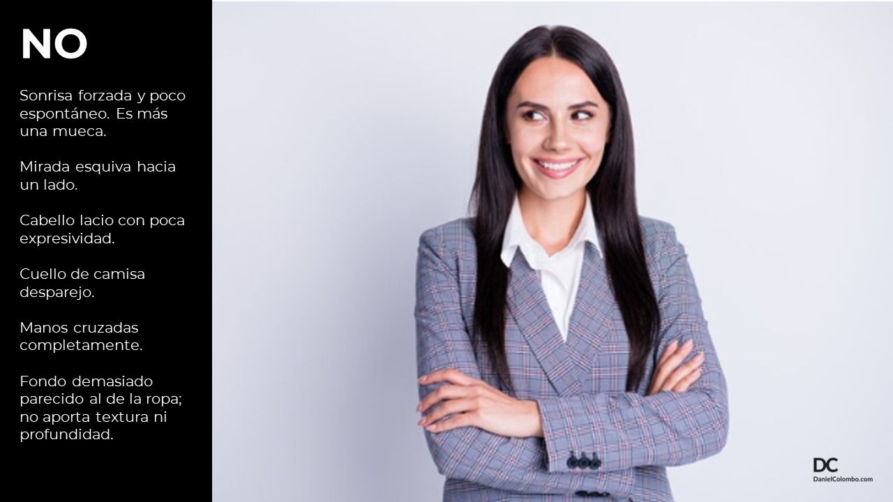 Ahora bien: por favor, no cruces más los brazos al ser retratado con fines profesionales. Esas fotos típicas de profesionales posando a tres cuartos perfil, mirando a cámara y con los brazos cruzados sobre el pecho no van más; al menos con esas poses de sonrisas fingidas y hasta de enojo, con los hombros subidos y la ropa arrugada.