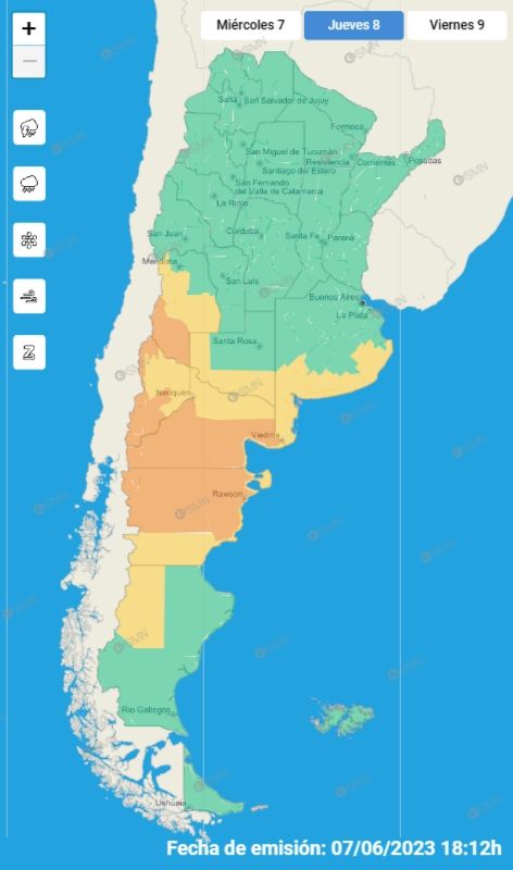 El pronóstico para el jueves indica cielo algo nublado y ascenso de la temperatura. La temperatura mínima esperada será de 8° y la máxima de 23º. En el departamento de Malargüe hay vigente una alerta naranja por viento Zonda que se extenderá en toda la zona de la cordillera y precordillera de los Andes. San Rafael, General Alvear y los departamentos del Valle de Uco se verán afectados por ráfagas de intensidad leve a moderada y la alerta vigente es amarilla.