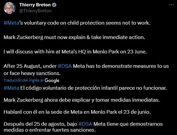 "Mark Zuckerberg debe ahora dar explicaciones y tomar medidas inmediatas", dijo Breton en un tuit, confirmando lo que un representante de la UE había dicho anteriormente a la agencia de noticias Reuters. "Discutiré con él en la sede de Meta en Menlo Park el 23 de junio".