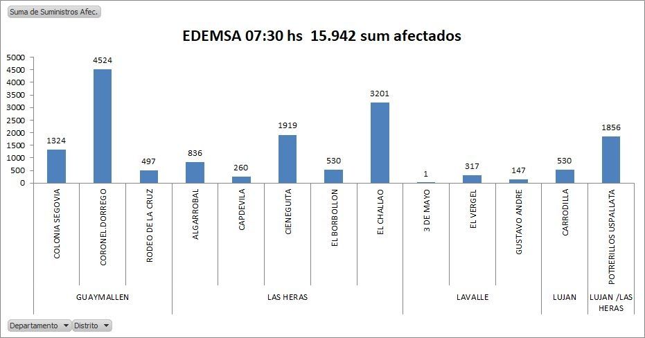 En el detalle del reporte se informa que hay un total de 4.524 usuarios de Edemsa que se han visto afectado solamente en Dorrego, mientras que 1.324 están sin ese servicio en Colonia Segovia y otros 500 usuarios en Rodeo de la Cruz, según confirmaron desde el Epre.