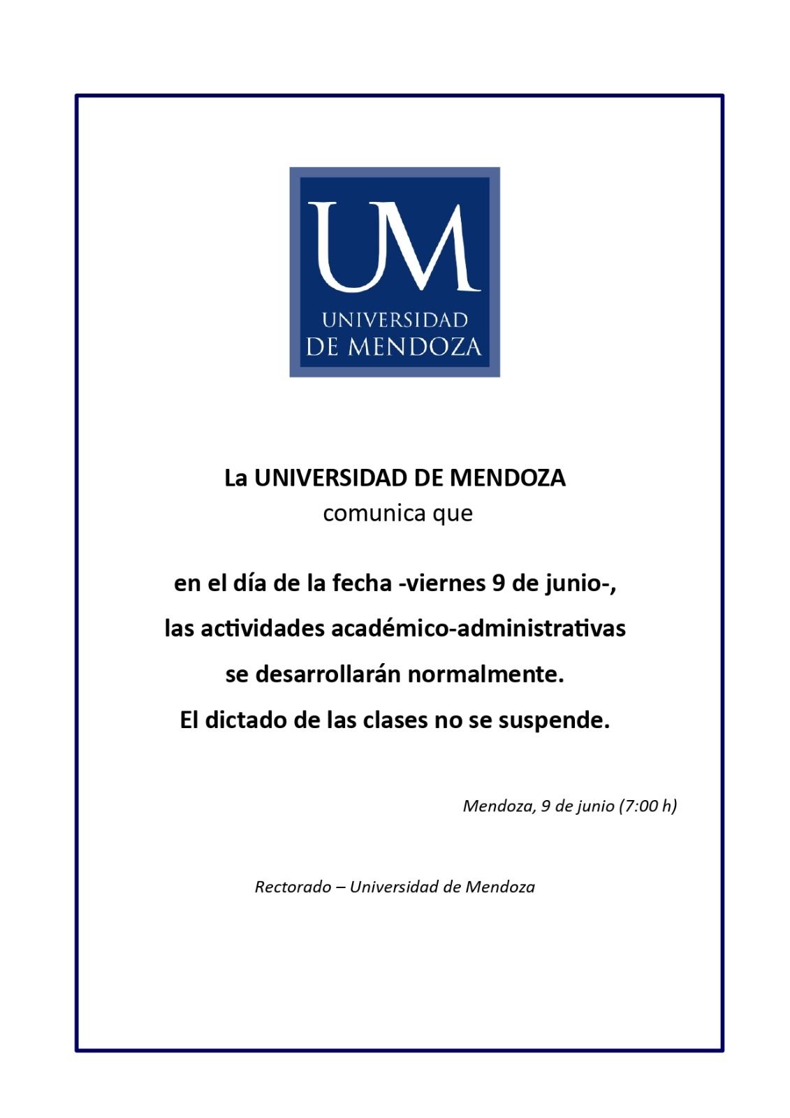 Sin embargo, en la Universidad de Mendoza confirmaron oficialmente que las clases se desarrollarán con normalidad y el dictado de clases no se suspende. Algo similar comunicaron a los alumnos de la Universidad Congreso, que también informó a través de su cuenta de Instagram que "hay actividades normales".