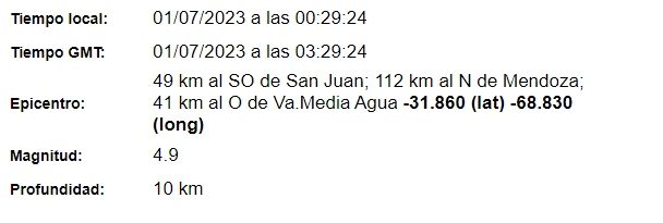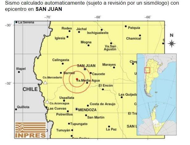 Según precisaron desde el Instituto Nacional de Prevención Prevención Sísmica (Inpres), el sismo tuvo lugar muy cerca de la frontera con Mendoza. Incluso, la coordenada precisa que su epicentro fue a 112 kilómetros al norte de la ciudad mendocina.