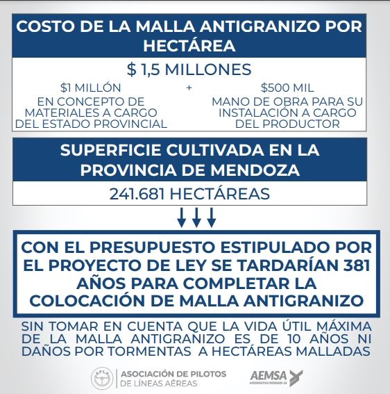 Desde el gremio de pilotos cuestionaron diferentes puntos como el costo total de implementación del programa tela antigranizo, el costo de reposición, las consecuencias del programa tela antigranizo en la producción, las consecuencias del programa tela antigranizo en las zonas urbanas, la pérdida de la eficiencia y el aprendizaje logrado por el sistema actual de lucha antigranizo.