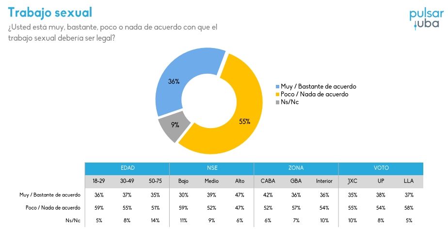El trabajo sexual es otro de los temas que genera debate en Argentina hoy. El informe del Observatorio Pulsar indica que el 36% de la población cree que el trabajo sexual debería ser legal en el país. Un 53% se opone a esta idea y un 10% prefirió nos responder, poniendo de relieve que se trata de un tema demasiado controversial para muchas personas.
