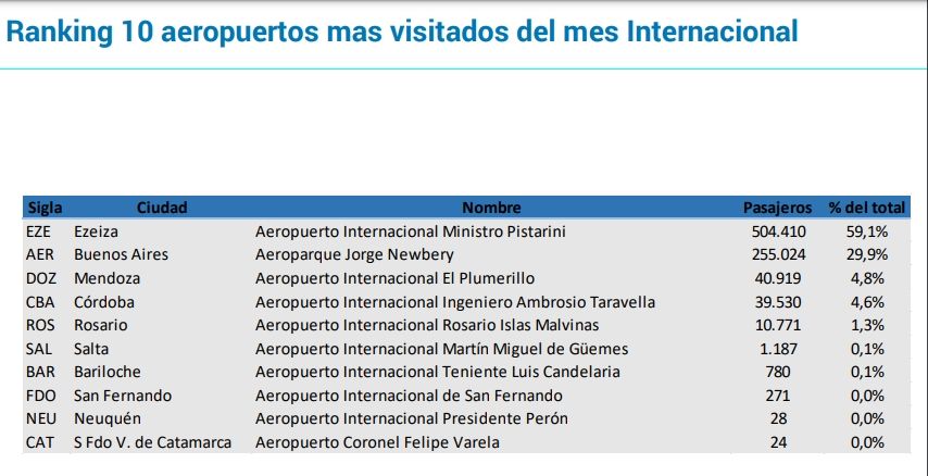 Entre las rutas o conexiones aéreas más visitadas a nivel nacional se encuentran: Bariloche-Rosario; Iguazú-Jujuy; Neuquén-Comodoro Rivadavia; Mendoza-Mar del Plata y Córdoba Usuahia. El dato a tener en cuenta es que son más de 137.000 personas que se conectaron a otros puntos del país sin tener que pasar por Buenos Aires. Teniendo en cuenta las rutas desde el interior a otros países, Mendoza cuenta con dos líneas muy frecuentes y utilizadas: una es Mendoza-San Pablo con 12.647 pasajeros y Mendoza-Santiago de Chile, con 19.474 pasajeros exactamente.