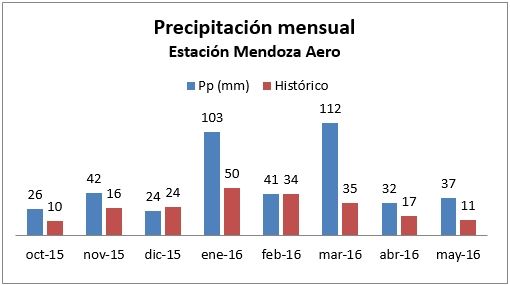 A partir de los mapas elaborados por el SMN, Bustos indicó que, durante el último trimestre del 2015, las anomalías de precipitaciones fueron ligeramente superiores a lo normal en el sudoeste provincial (San Rafael y Malargüe), mientras que fueron más importantes en el centro y noreste. Esto mismo ocurrió durante enero del 2016.