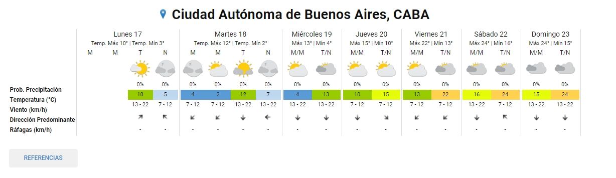 Por caso, el Servicio Meteorológico Nacional (SMN) pronostica para este fin de semana un rango de temperaturas, tanto para la Ciudad de Buenos Aires y el conurbano como para una decena de provincias, que irán de los 13 grados de mínima a los 35 grados de máxima.