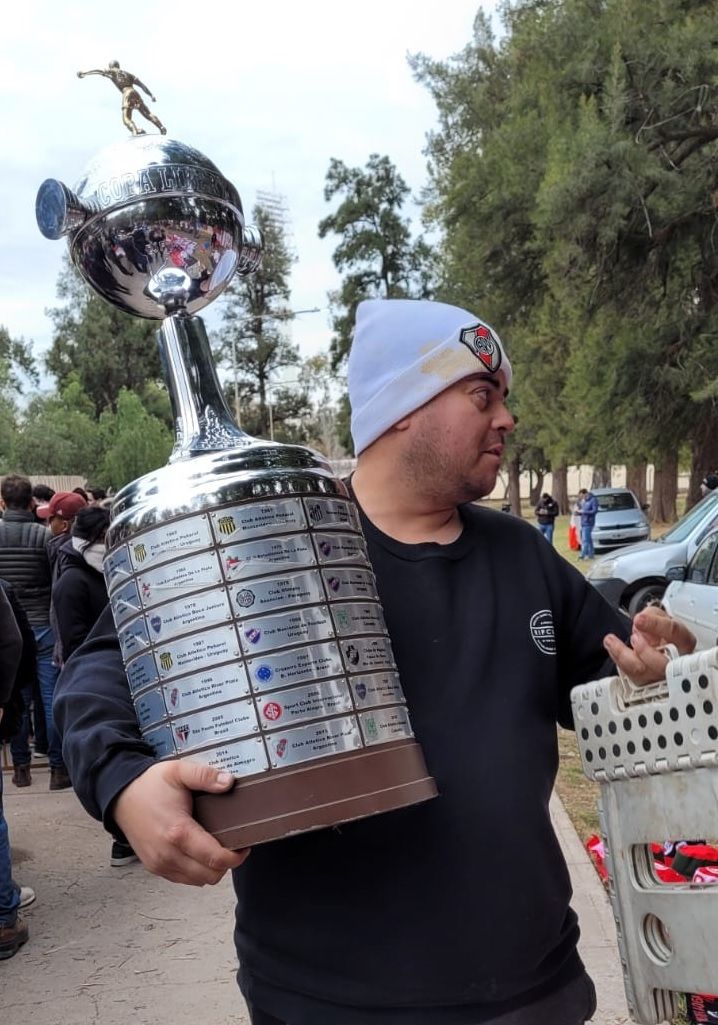 Otro caso emblemático es el de Gustavo, que viajó a Mendoza (también desde Córdoba) para el partido correspondiente a la Copa Argentina con una réplica de la Copa Libertadores, y vende una foto con el trofeo a cada hincha de River Plate que se lo requiera. La misma tiene un valor de $ 200.