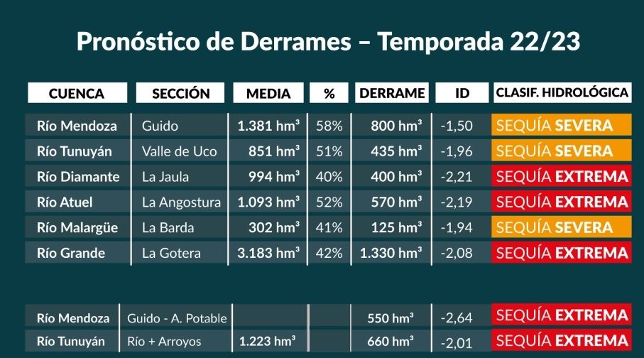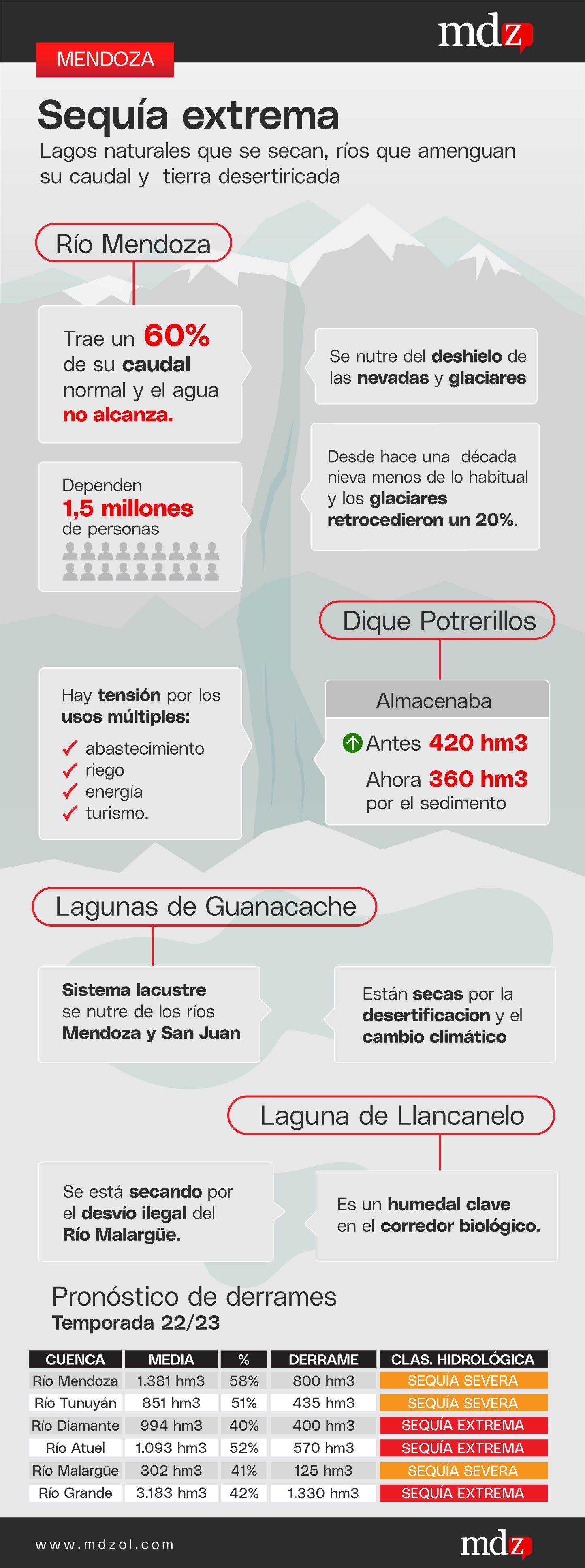 La Provincia, principalmente el oasis Norte, tiene disponible menos agua de la que consume y necesita. La sequía extrema que vive, la carencia, potencia la pelea por el acceso; la “guerra” del agua que es el principal conflicto ambiental y económico que enfrenta en la actualidad y hacia el futuro. La cuenca del Río Mendoza, que abastece a cerca de 1,5 millones de personas y más del 60% del PBG provincial, es donde el problema es más agudo. Este año no solo hay sequía, sino que está calculado que habrá mucha menos agua que la necesidad básica.