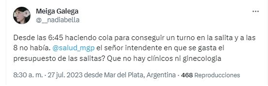 Una joven expresó su disgusto este jueves al hacer una cola desde las primeras horas de la mañana en un centro de salud y no encontrar una ginecóloga para que pueda atenderla. "Desde las 6:45 haciendo cola para conseguir un turno en la salita y a las 8 no había", lamentó la usuaria @__nadiabella en Twitter.