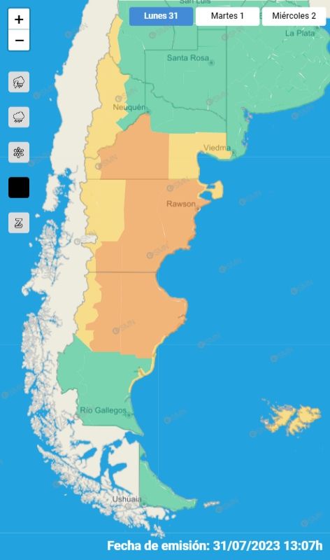 El Servicio Meteorológico Nacional emitió un alerta de nivel rojo por viento para la madrugada del martes 1 de agosto para la costa norte de la provincia de Santa Cruz y la costa sur y centro de la provincia de Chubut. Desde el mediodía de este lunes, los vientos se intensificaron, alcanzando su máxima intensidad hacia el final de esta noche y la madrugada del martes.
