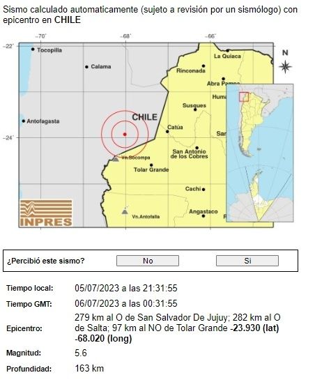 Poco antes, en Chile se reportó un temblor de gran magnitud: 5.6, a las 21.31. El epicentro fue en Chile, a 279 km al oeste de San Salvador De Jujuy y 282 km al oeste de Salta.