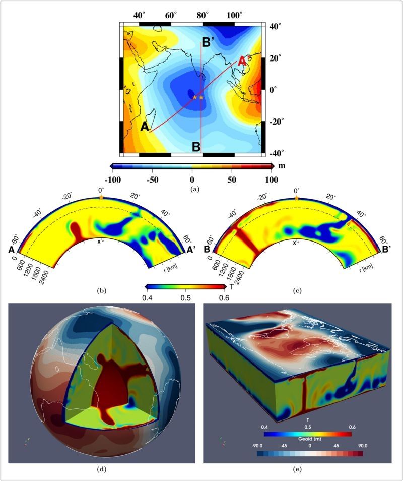 En seis de las simulaciones, la forma y la amplitud del geoide bajo del océano Índico coincidieron estrechamente con los datos reales.