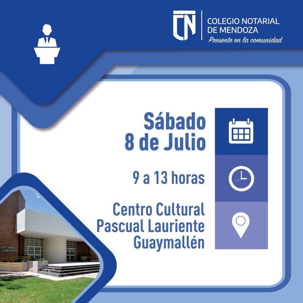 La iniciativa llevada adelante por el Colegio Notarial de Mendoza tiene como finalidad mostrar la función social del notariado en la comunidad, y en esta segunda jornada provincial de asesoramiento notarial comunitario -que se realizará el sábado 8 de julio por la mañana- el punto de encuentro será el Centro Cultural Pascual Lauriente (Guaymallén).