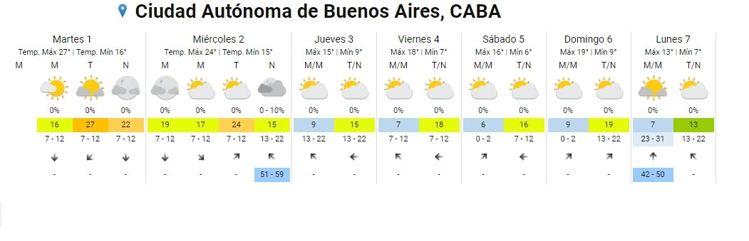 Para mañana miércoles el organismo prevé una jornada con cielo algo nublado a parcialmente nublado, luego mayormente nublado; vientos del sector norte rotando al noroeste, luego variable, con ráfagas de 60 kilómetros por hora a la noche; y una temperatura que se ubicará entre 15 grados de mínima y 24 de máxima.