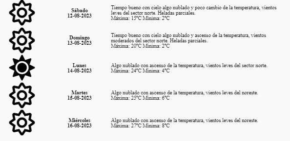 “Tiempo bueno, con cielo algo nublado y poco cambio de la temperatura”, anticipa, además de “vientos leves del sector norte” y “heladas parciales”.
