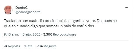 "Votó L-Gante No pudo votar el cirujano País inviable", escribió al mismo tiempo que se emitían las imágenes en varios canales de televisión el tuitero @LicTraviata. Mientras que @lucholombardi también mostró su indignación con un fuerte comentario: "Paradoja de un Pais en decadencia. Una nena muere por falta de seguridad y a L-Gante lo acompaña un sequito de policias pagados por nosotros para ir a votar".
