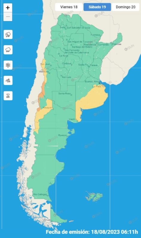 El pronóstico para el sábado indica cielo parcialmente nublado y poco cambio de la temperatura. La temperatura mínima esperada será de 4° y la máxima de 16º. El SMN emitió una alerta naranja por intensas nevadas en la cordillera de los Andes para ese día y el domingo.