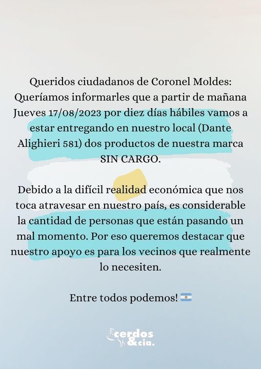 Según relató a radio Ciudad de Coronel Moldes, una iniciativa similar ya la había puesto en marcha durante la crisis económica que generó la pandemia del Covid-19. Ahora, ante la incertidumbre económica, decidió retomar la campaña solidaria.