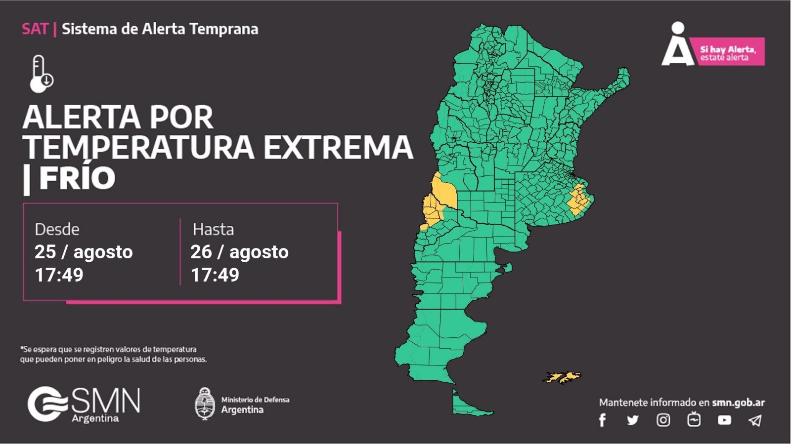 El Servicio Meteorológico Nacional (SMN) emitió en las últimas horas un alerta amarilla por "temperaturas extremas de frío", para unos quince distritos de la zona este de la provincia de Buenos Aires.