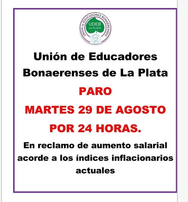 En tanto, por intermedio de un comunicado en redes sociales, el SUTEBA MULTICOLOR seccional La Plata se plegó al paro docente de UDEB, convocando a los docentes de La Plata a una asamblea general este mediodía en reclamo de "reapertura inmediata de paritarias" y un "salario igual a la canasta familiar por cargo".