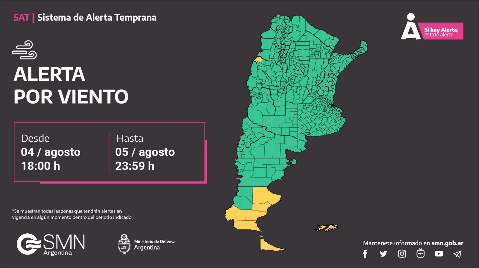 El SMN informó que el área mencionada "será afectada por vientos del sector oeste rotando hacia el sudoeste, con velocidades entre 50 y 75 km/h, con ráfagas que pueden alcanzar localmente los 100 km/h".