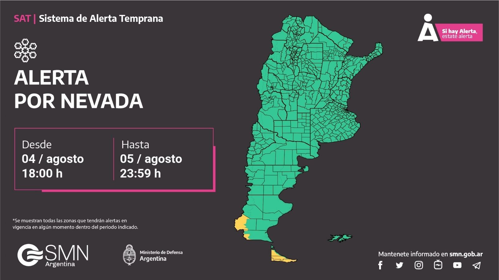 Luego de una semana con complicaciones climáticas para varias zonas del país, el Servicio Meteorológico Nacional (SMN) arranca el fin de semana con un alerta por vientos fuertes y por nieve para zonas de las provincias de Santa Cruz y Tierra del Fuego, Antártida e Islas del Atlántico Sur.