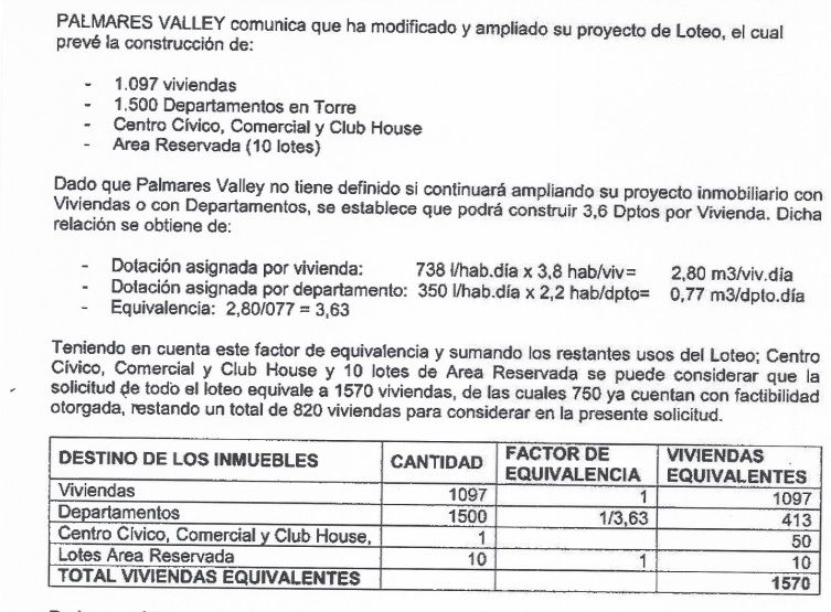 El condicionamiento para Palmares era ejecutar 2 perforaciones de agua potable que devuelven al sistema “el doble del caudal” previsto para el barrio privado. Originalmente los pozos se iban a ubicar en Las Heras, pero la calidad del agua era muy mala. Por eso se mudó la localización para reforzar la dotación en el distrito Jesús Nazareno de Guaymallén. Cuando la empresa de aguas se reestatizó, hubo una ampliación a favor de Palmares. A través de la Resolución de Directorio N° 117/2011, se autorizó a derivar más agua al lugar, para abastecer en total “1125 viviendas unifamiliares o departamentos equivalentes del Fraccionamiento PALMARES VALLEY”, permitiendo expandir el desarrollo inmobiliario en el pedemonte. El condicionamiento era hacer los dos pozos ya comprometidos y le sumaron un tercero en el Loteo Andesmar. La empresa complió las exigencias. Según los informes de AYSAM, “en esos años entregó el doble de la dotación que ocupará cuando se termine el emprendimiento inmobiliario”. Hoy Palmares Valley ha crecido hasta un “40 o 50% de lo previsto”.