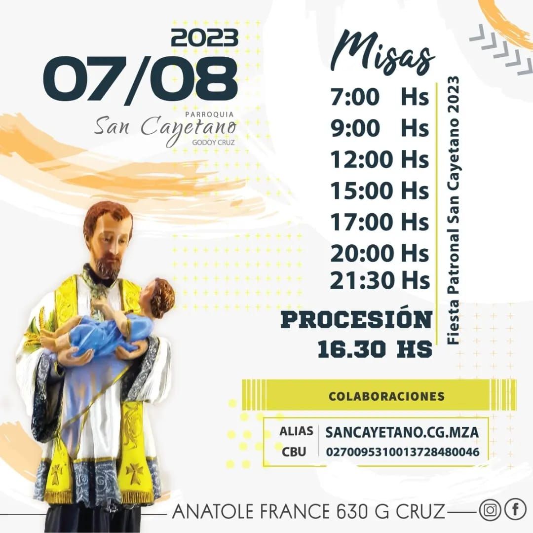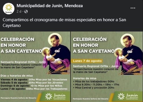 En tanto, la Municipalidad de Junín informó que en el Santuario de Orfila las misas se celebrarán a las 9.30, 11.30, 15 y 17. En tanto, la procesión "Ensanchemos nuestro corazón en la mano de San Cayetano" se realizará a las 20.