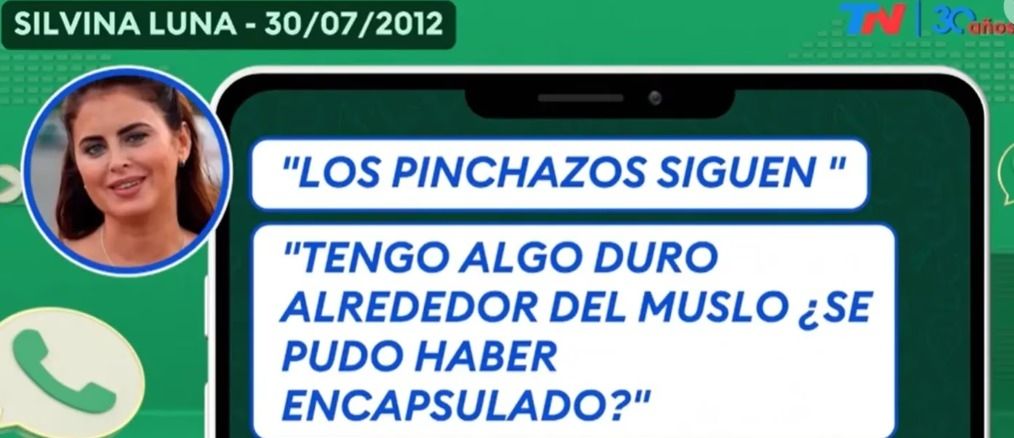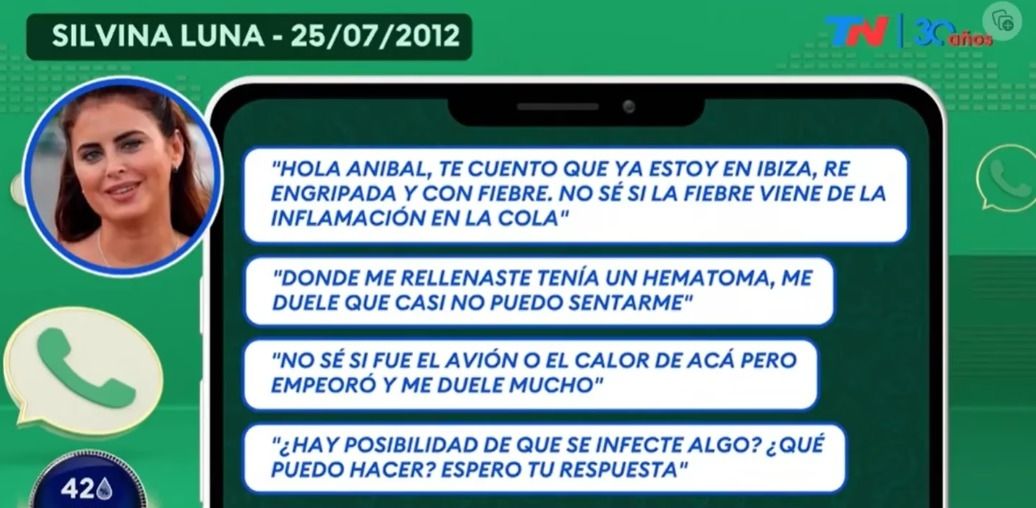 “Hola Aníbal, te cuento que ya estoy en Ibiza, re engripada y con fiebre. No sé si la fiebre viene de la inflamación en la cola. Donde me rellenaste, tengo un hematoma, me duele y casi no puedo sentarme. No sé si fue el avión o el calor de acá, pero empeoró y me duele mucho. ¿Hay posibilidad de que se infecte algo? ¿Qué puedo hacer? Espero tu respuesta”, le escribió Luna a Lotocki y agregó: "Los pinchazos siguen... Tengo algo duro alrededor del músculo... ¿Se pudo haber encapsulado?".