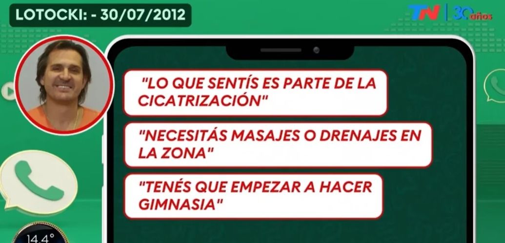 Luego, Lotocki le respondió: “Lo que sentís es parte de la cicatrización. Necesitás masajes o drenajes en la zona... Tenés que empezar a hacer gimnasia”.