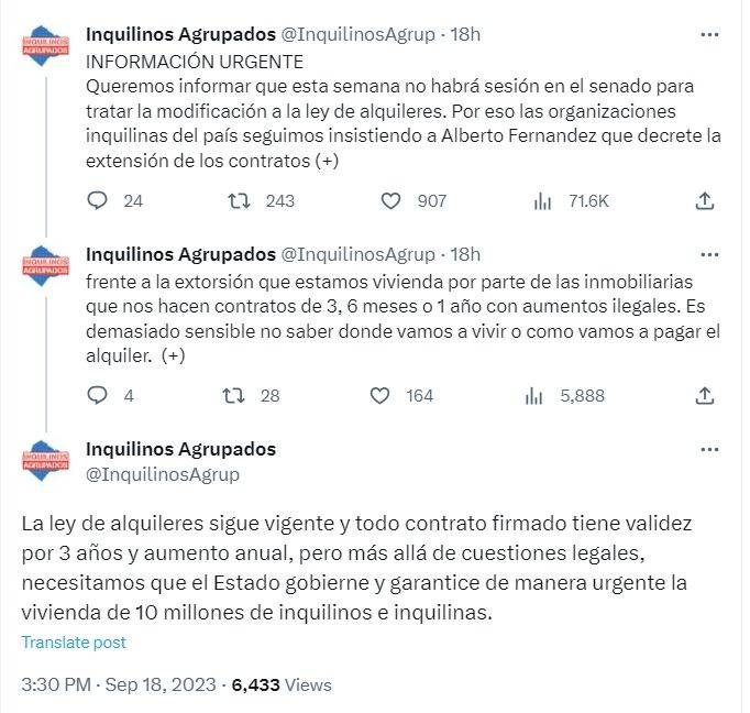 Esta semana estaba previsto que se realice una sesión en el Senado para tratar la modificación de la ley, sin embargo no se va a realizar por lo que la asociación Inquilinos Agrupados lanzó un fuerte pedido al presidente de la Nación, Alberto Fernández: "Las organizaciones inquilinas del país seguimos insistiendo a Alberto Fernández que decrete la extensión de los contratos frente a la extorsión que estamos vivienda por parte de las inmobiliarias que nos hacen contratos de 3, 6 meses o 1 año con aumentos ilegales. Es demasiado sensible no saber dónde vamos a vivir o cómo vamos a pagar el alquiler", señalaron y recordaron que "la ley de alquileres sigue vigente y todo contrato firmado tiene validez por 3 años y aumento anual", sin embargo insistieron en un punto: "Más allá de cuestiones legales, necesitamos que el Estado gobierne y garantice de manera urgente la vivienda de 10 millones de inquilinos e inquilinas".