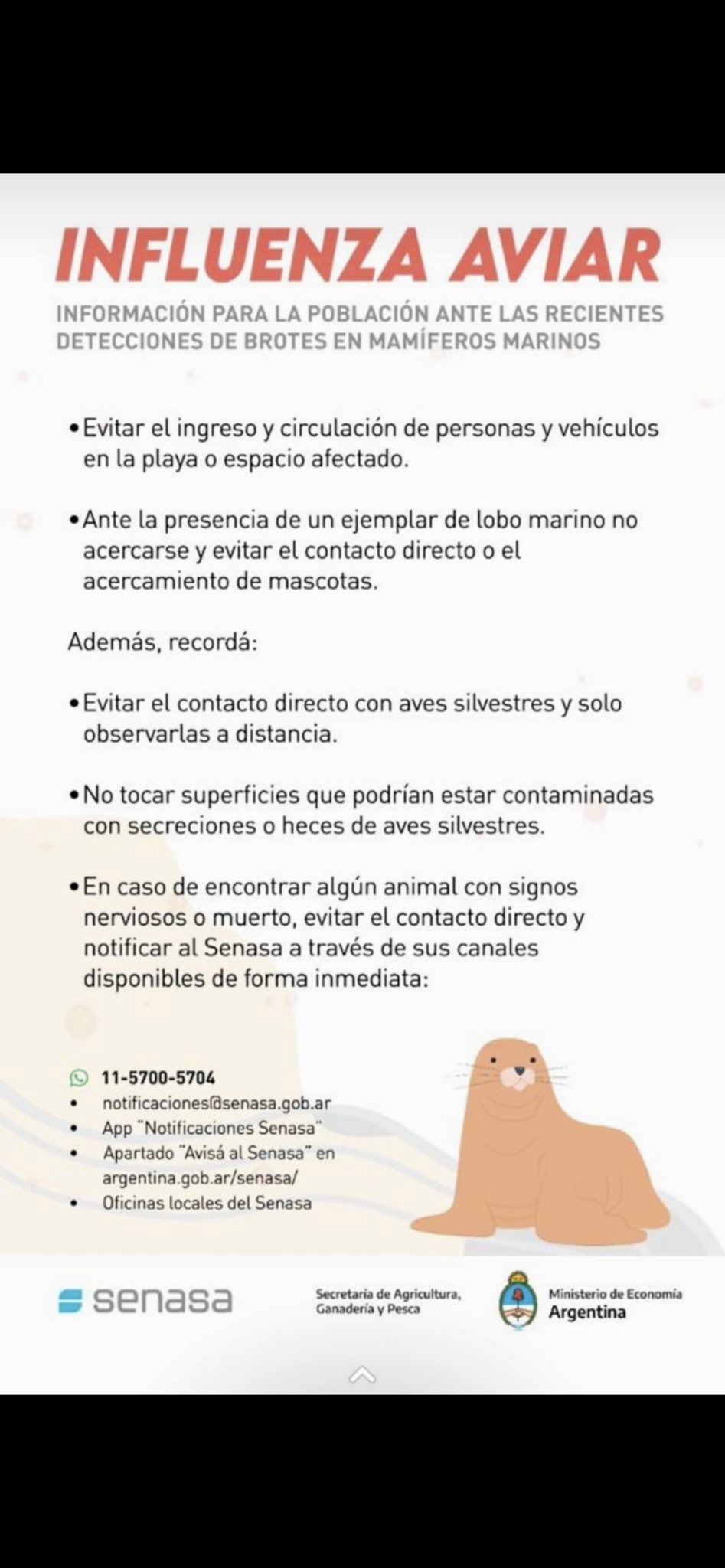 - Ante la presencia de animales silvestres, como aves y lobos marinos enfermos o muertos, no acercarse y evitar el contacto directo.