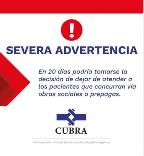 La Confederación Unificada Bioquímica de la República Argentina (Cubra), advirtió en las últimas horas que en 20 días podría tomarse la decisión de dejar de atender a los pacientes que concurran vía obras sociales o prepagas, si no se corrigen los desajustes causados por la inflación y los retrasos en los pagos.