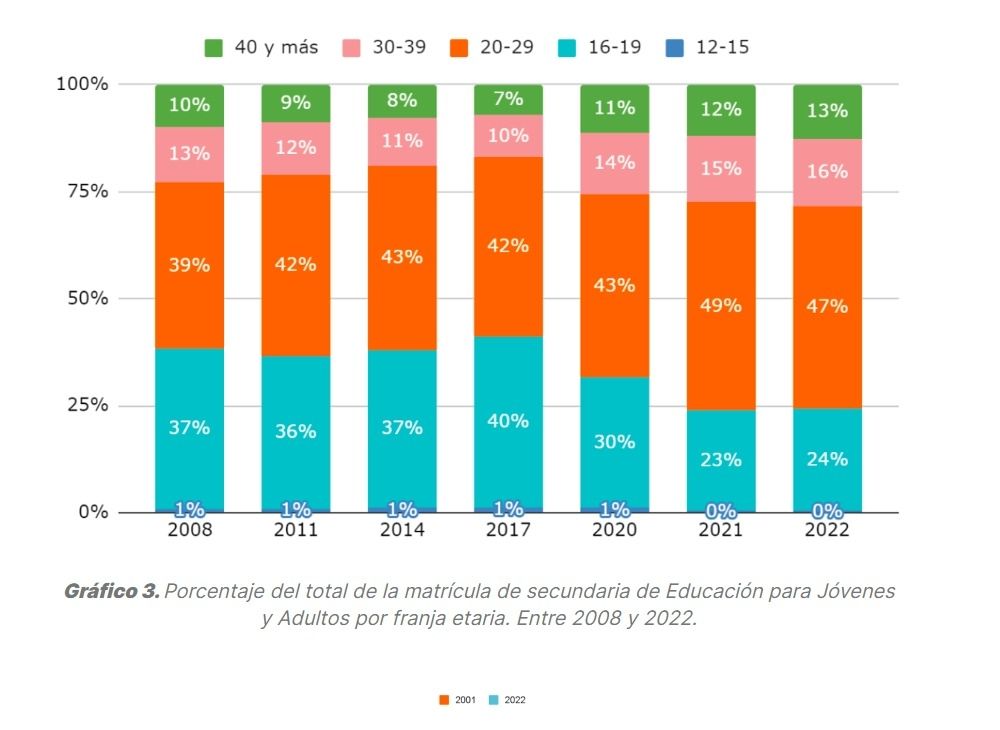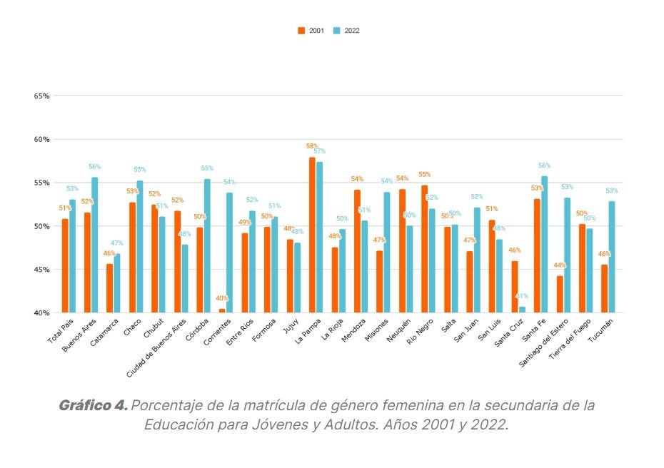 Otros datos del documento indica que "más del 90% de los jóvenes y adultos que cursan en esta modalidad asisten a escuelas de gestión estatal" y que "entre 2001 y 2022, la matrícula se expandió de forma más o menos constante". Por otro lado, dice que "a lo largo de estos años, también se dio una progresiva feminización, tanto en la matrícula como en el egreso: las mujeres representan el 53% del alumnado" y que "en cuanto a la edad, 7 de cada 10 estudiantes (71%) tienen menos de 29 años; un 13% de la matrícula tiene más de 40 años".