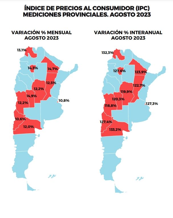 En ese contexto, cinco distritos registraron alzas del IPC superiores al total país relevado por el INDEC en agosto. San Luis queda a la cabeza con suba del 14,9%, seguida por Chaco (14,7%), Tucumán (14,3%), Jujuy (13,1%) y Santa Fe (12,5%). Por el contrario, en Neuquén se vio el incremento más leve del mes (10,6%).
