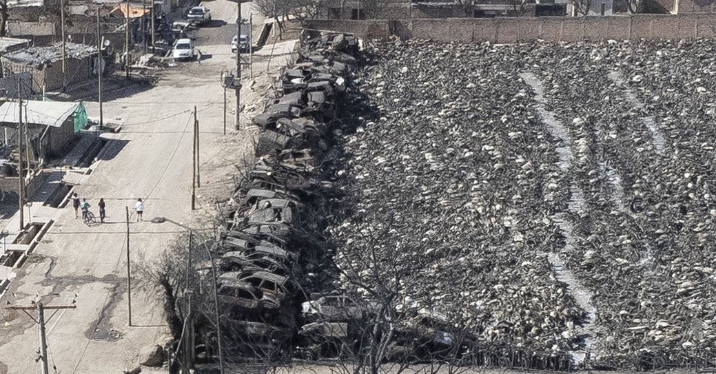 Autos de la década del 70, algunos con las huellas de la dictadura; un colectivo del mendozazo, camionetas de lujo secuestradas a bandas narco; cientos, miles de autos que tiene en sí pruebas de crímenes irresueltos y motos de todo tipo que amontonan. Los vehículos se acumulan como capas geológicas en la playa San Agustín y hay distintos tonos de negro, gris, un rojizo de herrumbre y tonos sepia. Son más de 27 mil que ahora son una masa amorfa, quemada, maloliente y peligrosa. Por cada auto hay un crimen NN o un delito investigado hasta el infinito, pues a diferencia de lo que se cree, la mayoría no pertenece a infractores sino a delincuentes, sospechosos o víctimas de algún crimen.