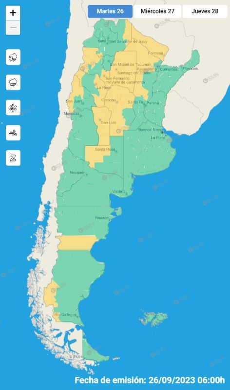 El Servicio Meteorológico Nacional (SNM), a través de su Sistema de Alertas Meteorológicas Tempranas (SAT), pronostica para este martes tormentas intensas y ráfagas de viento que afectarán algunas provincias argentinas. Debido a la magnitud de los fenómenos, emitió una alerta amarilla.