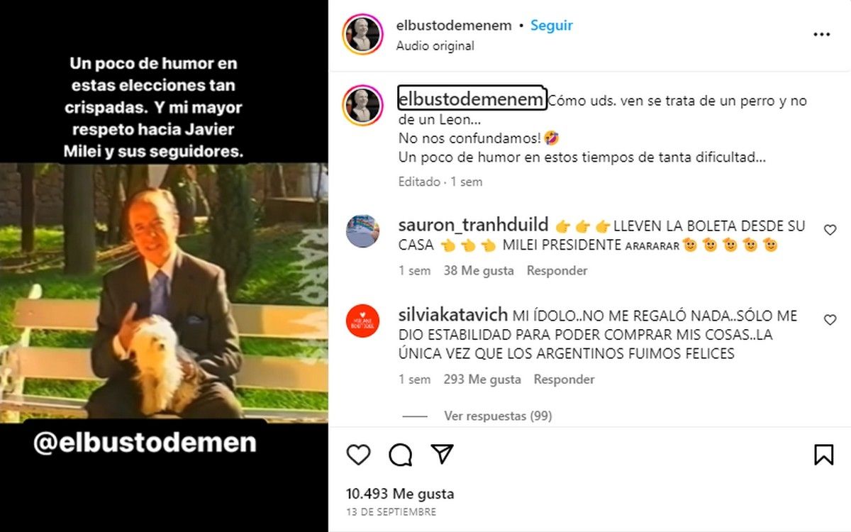 Entre las publicaciones hay imágenes de Menem junto a diferentes personalidades como el Rey Carlos III de Inglaterra, Diego Maradona, Susana Giménez, Mirtha Legrand o los Rolling Stone, entre otros. Y los comentarios de los seguidores en muchos casos son desopilantes, aunque otros reivindican la política de convertibilidad de los años noventas y hay incluso quienes se expresan simpatizantes de Javier Milei,
