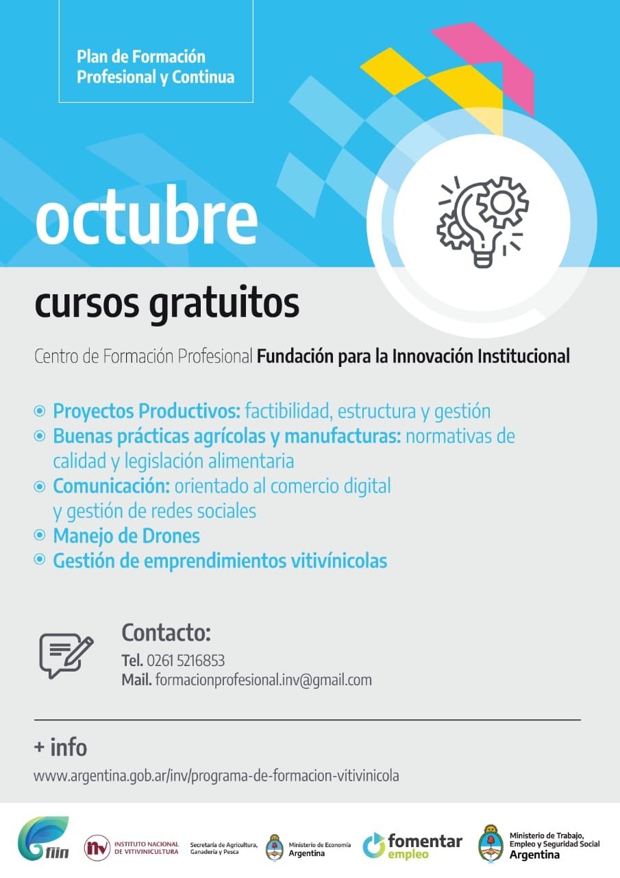 El Ministerio de Trabajo, Empleo y Seguridad Social de la Nación, en colaboración con el Instituto Nacional de Vitivinicultura (INV) y la Fundación para la Innovación Institucional, anunciaron una invitación masiva a participar en los cursos de Formación Profesional y Sectorial que iniciarán en el mes entrante, octubre.