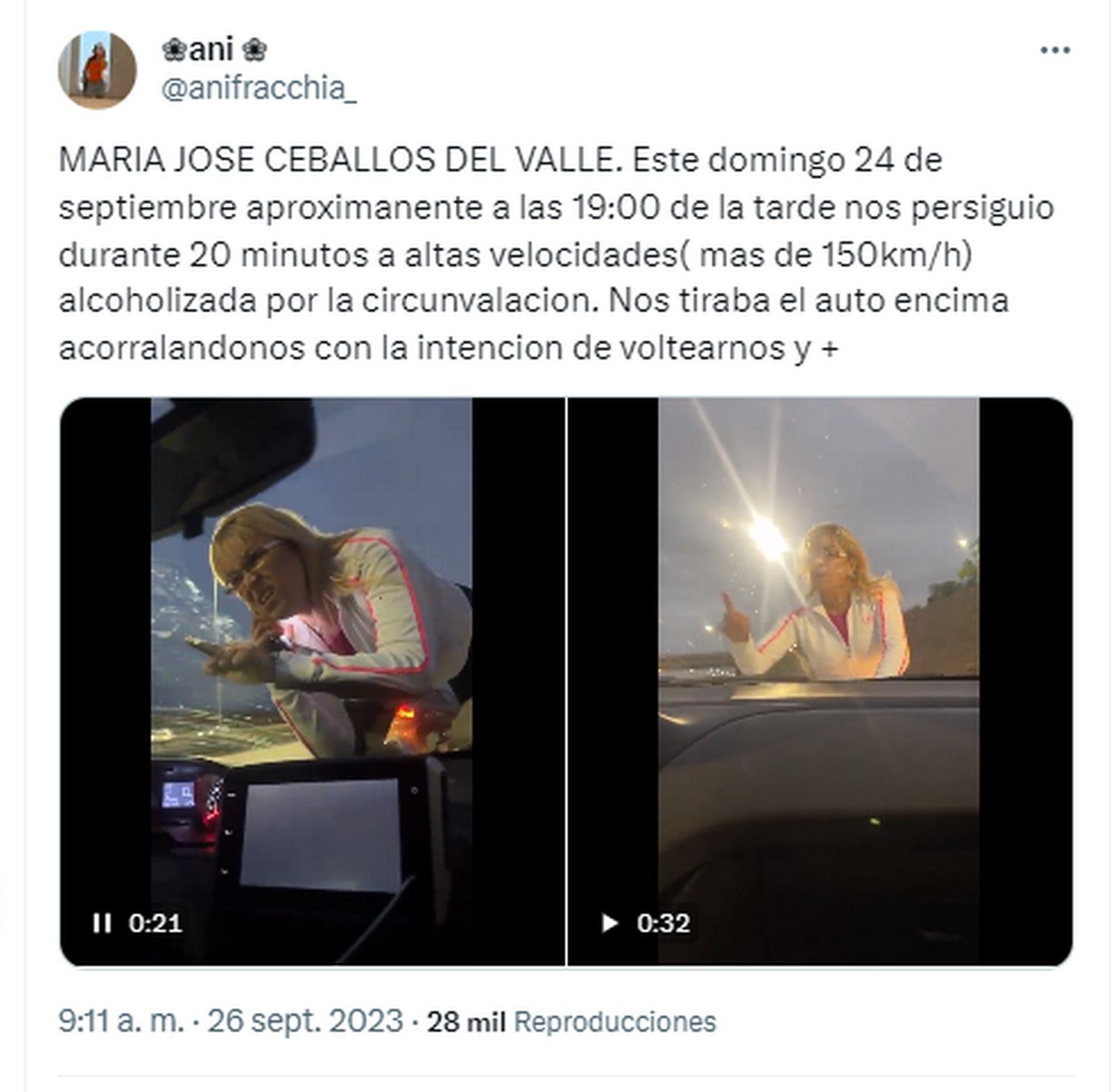 “Este domingo 24 de septiembre, aproximadamente a las 19 nos persiguió durante 20 minutos a altas velocidades (más de 150 kilómetros por hora), alcoholizada, por la Circunvalación. Nos tiraba el auto encima acorralándonos con la intención de voltearnos y quitarnos de la calle”, comenzó describiendo @anifracchia_ en la red social.