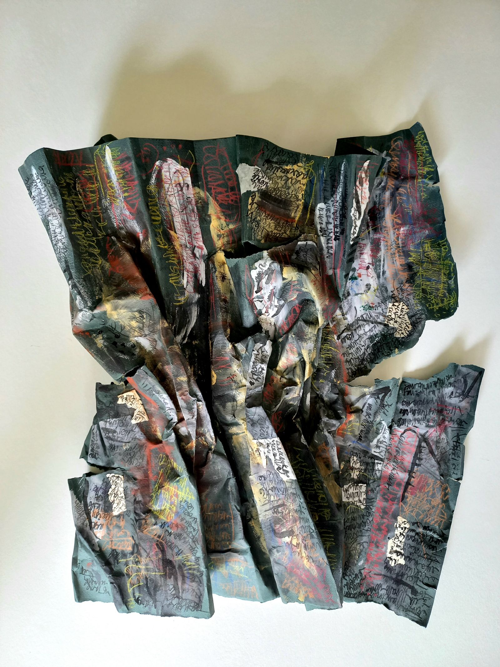 La diversidad de materias, en la obra reciente de Gotcha, da una fuerte sensorialidad al fluir laberíntico. A los papeles opacos o transparentes, de distintos espesores tonos y texturas se suman cartones lisos o acanalados, hilos y cintas. Su combinación permite construir palimpsestos en los que se acumulan capas sobre capas de escrituras.