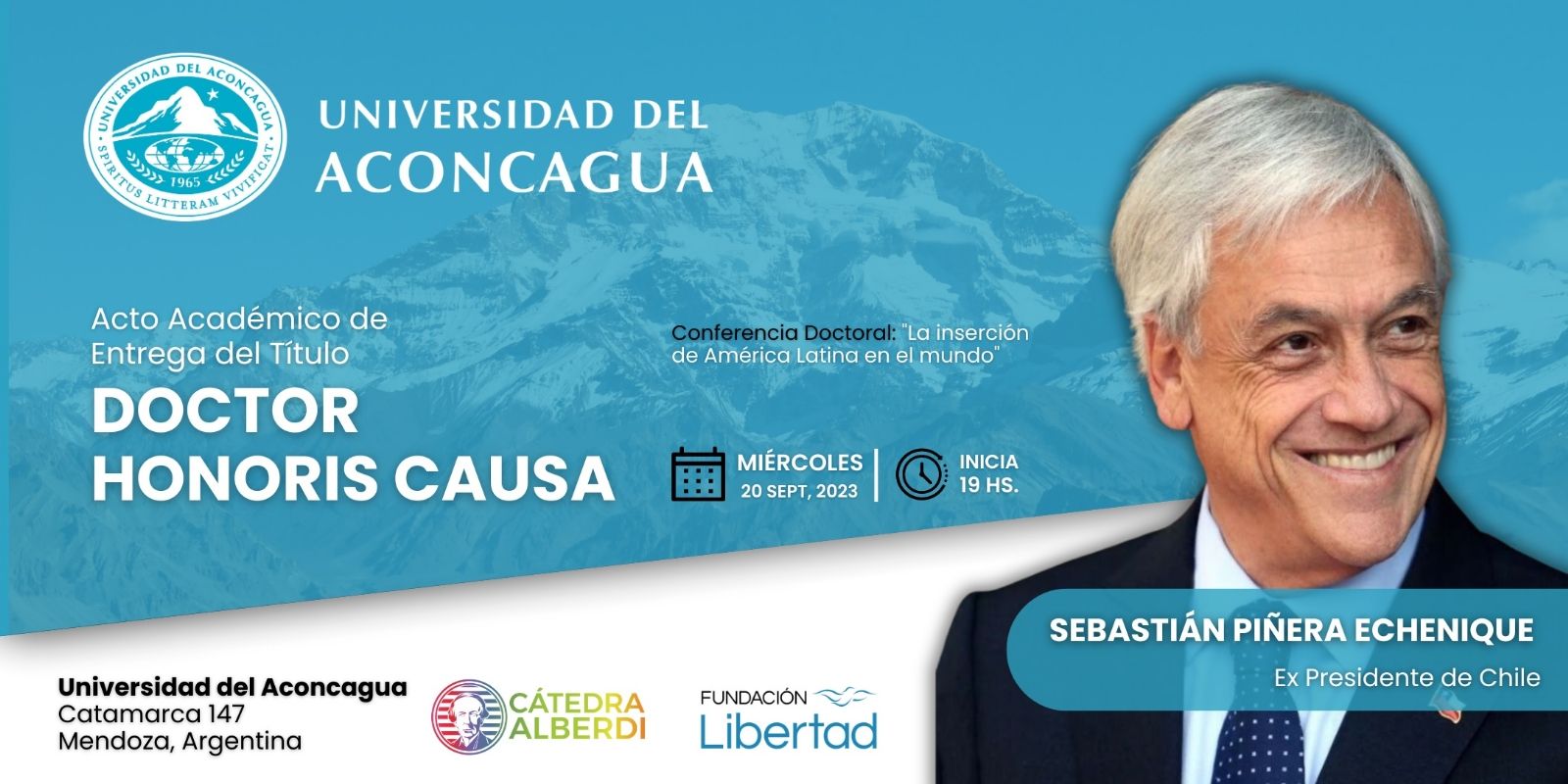 La Universidad del Aconcagua anunció que el próximo 20 de septiembre, a las 19 horas, recibirán al Dr. Sebastián Piñera y le entregarán el título de Doctor Honoris Causa. El acto en el que se reconocerá al dos veces electo presidente de Chile se llevará a cabo en el Salón Auditorio (Catamarca 147) y anuncian que será “un hito en la vida académica de la Universidad”.