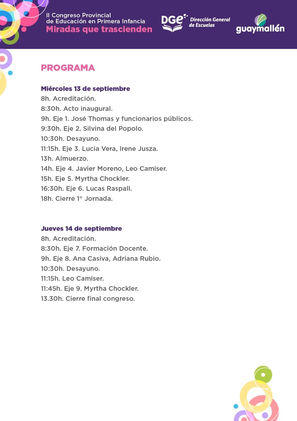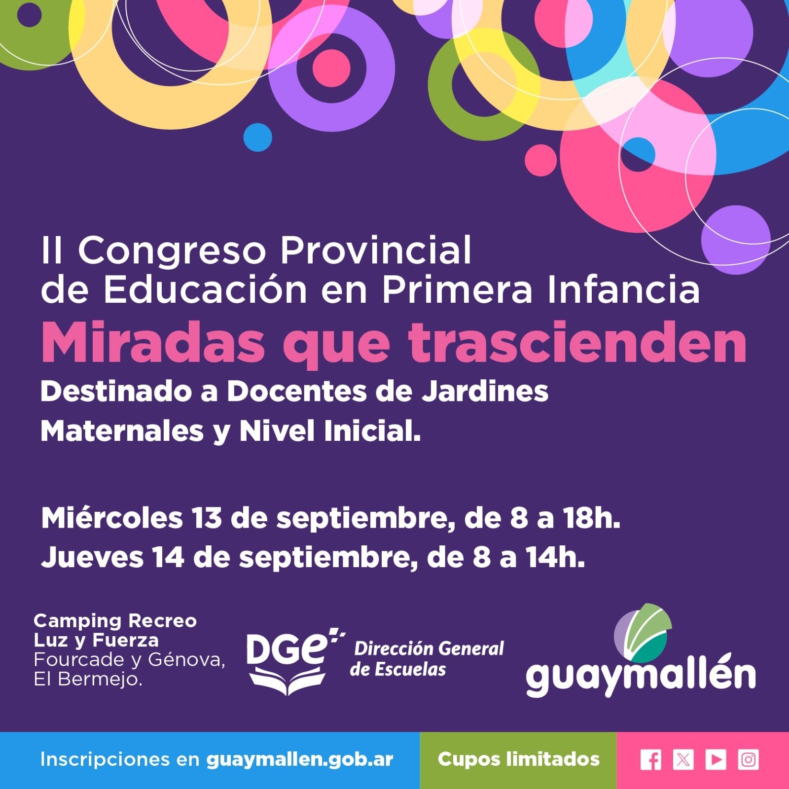 En esta oportunidad el congreso se realizará los días 13 y 14 de septiembre del corriente año de 8 a 18 en el camping Recreo Luz y Fuerza. Se esperan para el mismo alrededor de 700 personas. Este II Congreso Provincial de Primera Infancia tiene como eje conductor “Las Miradas”, pensando en las diversas miradas que convocan al trabajo con la primera infancia, miradas que suman y acompañan desde una gestión comprometida a poner en valor toda siembra en estos años de vida de niños y niñas.